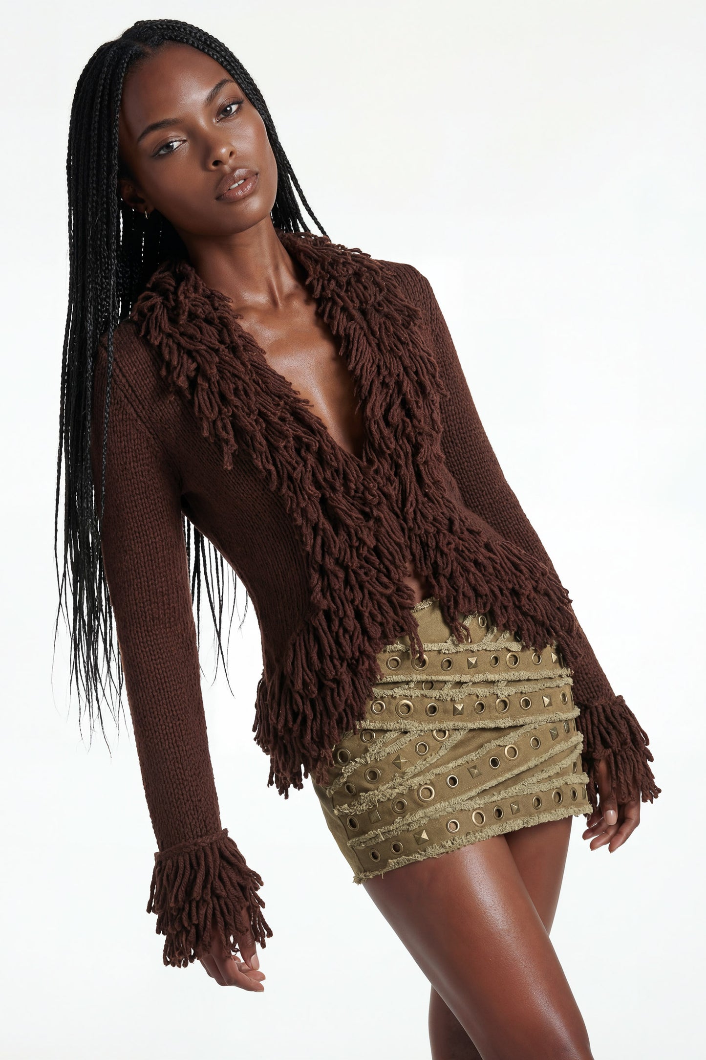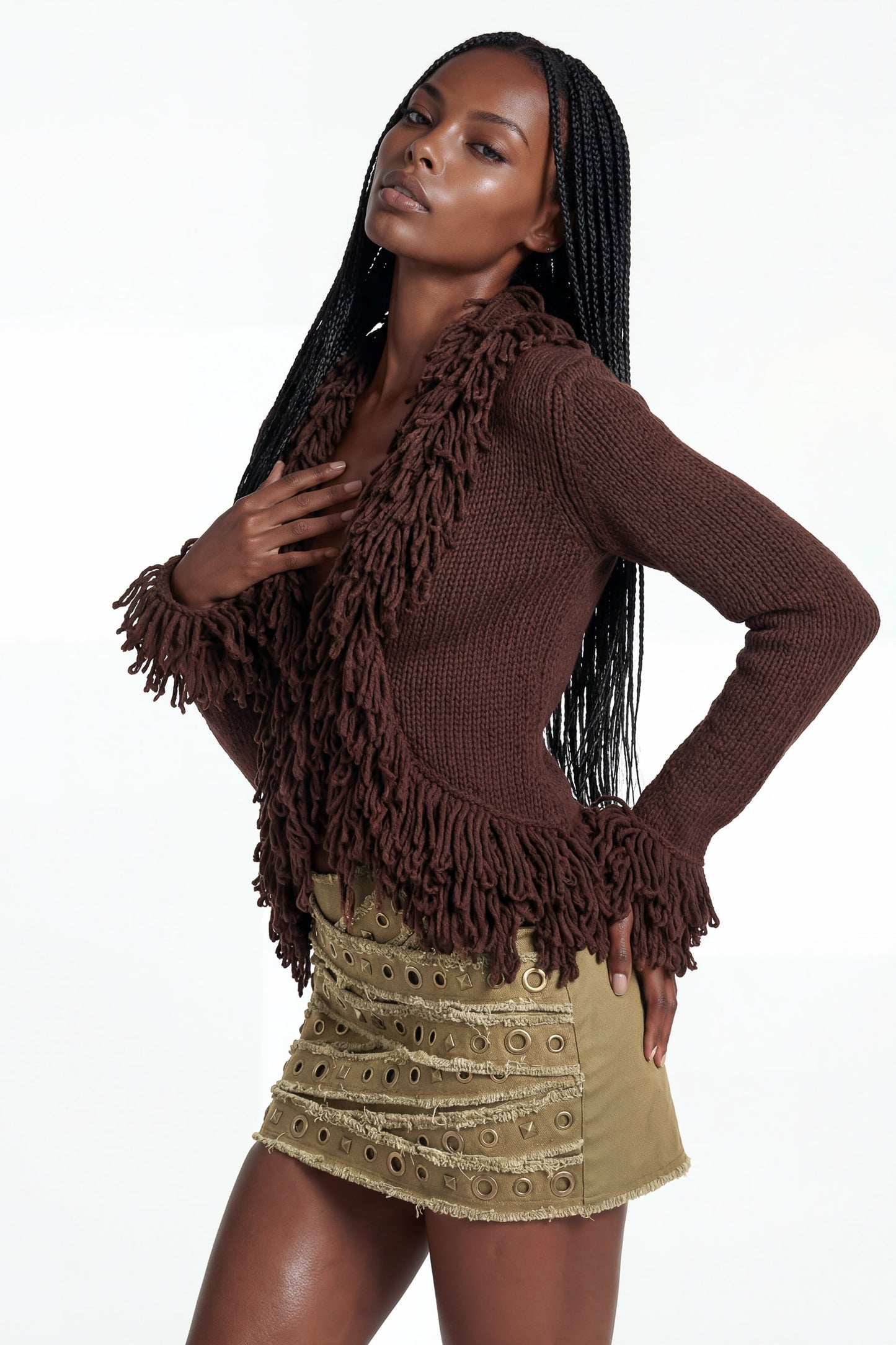 Knitted fringe detailing throughout front and hem.